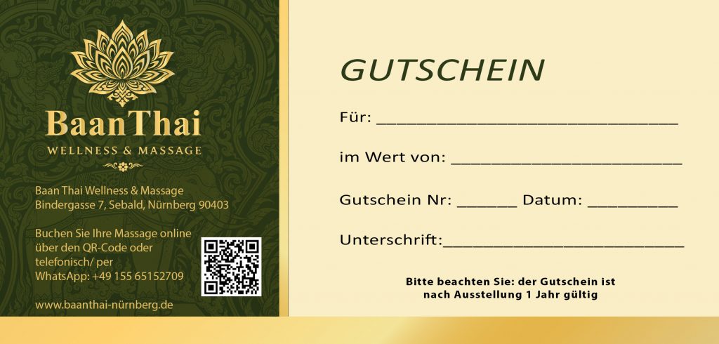Ein Gutschein von BaanThai Wellness & Massage ist das perfekte Geschenk für besondere Anlässe – oder einfach, um einem lieben Menschen eine Auszeit vom Alltag zu schenken.